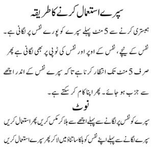 نوٹ : ہمبستری سے 15 منٹ پھلے نفس پر 3 دفع سپرے کریں اس کے بعد نفس کو دھونا نہیں ہے